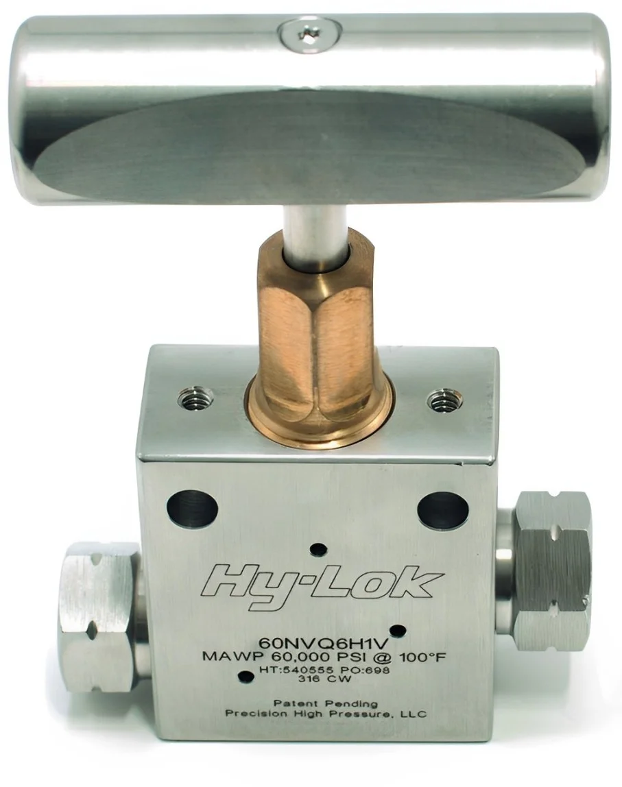 316 SS, Hy-Lok High Pressure Valves, Needle Valve, Gass Filled Teflon Packing, 1/4 Female NPT x 1/4 Female NPT, 15000 psig (1034 bar), -100°F to 600°F (-73°C to 316°C), 6.4mm Orifice, Straight